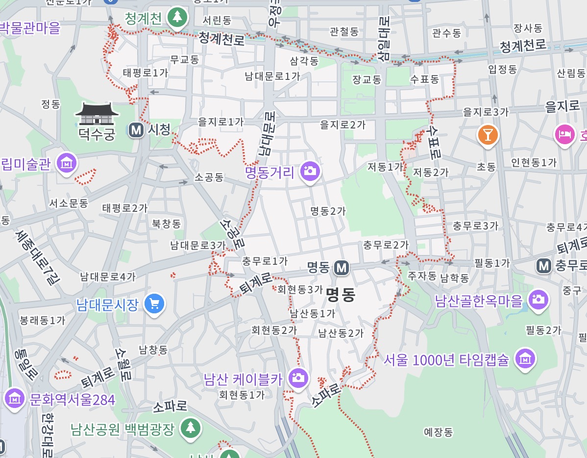 숙소가 명동이라면 4개의 권역의 맛집에 걸어서 갈 수 있습니다. 도심의 지하철역 간 거리가 1킬로(도보로 약 15분 거리)가 안되기 때문입니다.
