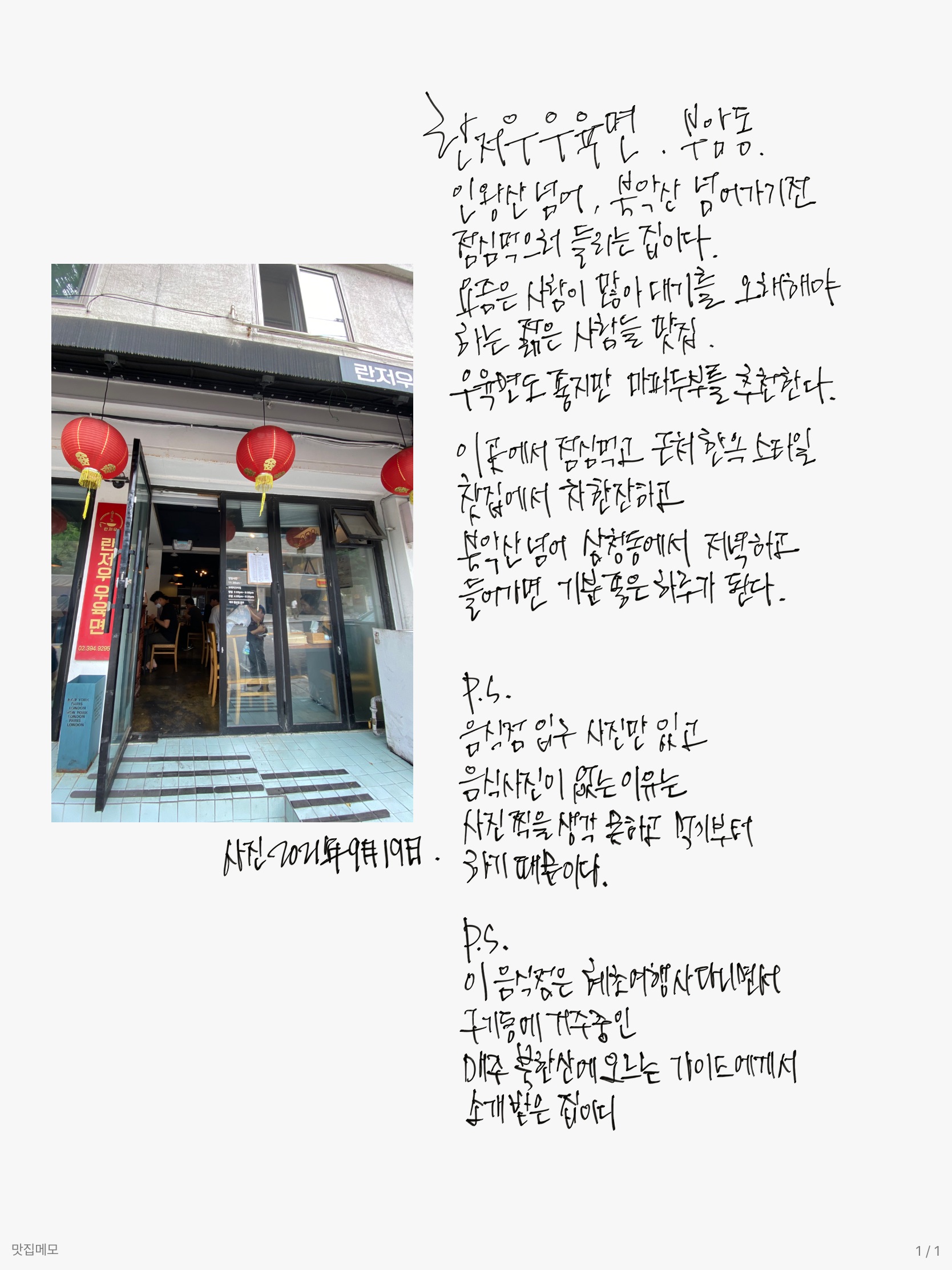 서쪽으로는 청와대, 동쪽으로는 북한산, 북쪽으로는 북악산, 남쪽으로는 인왕산이 있는 고갯마루에 있는 중화풍 탕면입니다. 아래의 글은 2021년 코로나가 심할 때 그곳을 지나며 적은 메모입니다.