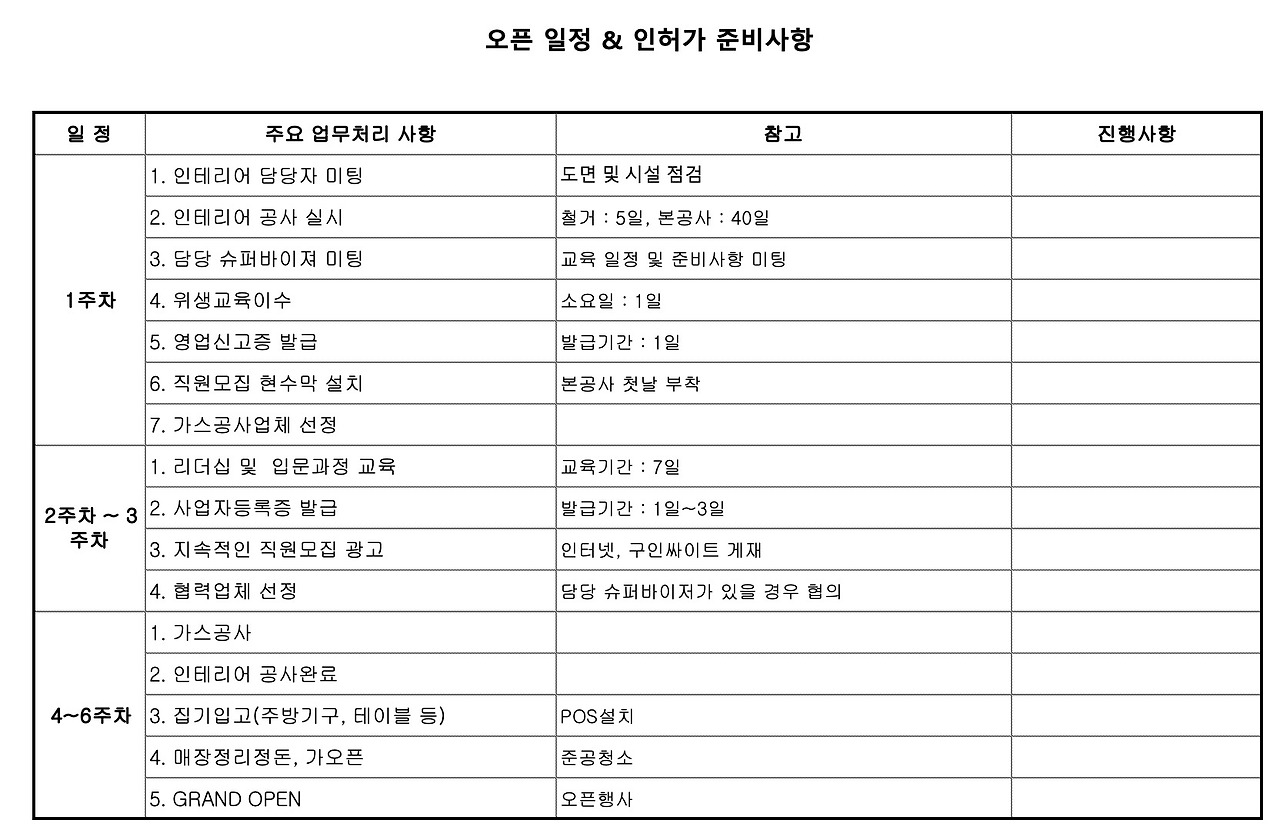 창업 후 오픈까지 6주간 체크 리스트입니다. 출력해서 사용하실 경우 A4 가로 화면에 맞도록 설정해 두었습니다. 지인을 통해 얻은 자료로 창업 후 오픈까지 6주간 체크해야 할 내용에 대한 리스트입니다. 첨부 엑셀 본문의 내용은 아래와 같습니다.