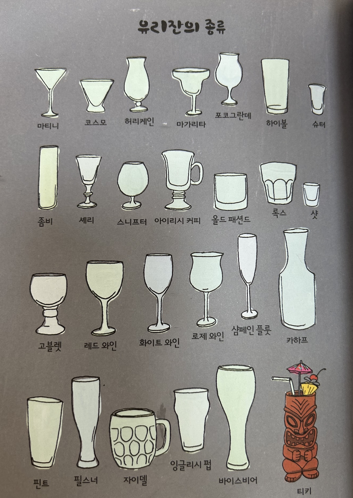 유리잔의 모양에 따라 이름이 붙어 있지만 절대적이지 않습니다. 해당 지역마다 부르는 이름이 다르기 때문입니다. 아래의 그림은 담는 용도에 따라 이렇게 부르는구나라고 생각하면 편합니다.